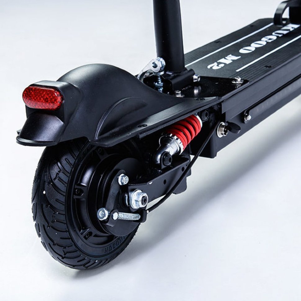 Электросамокат Kugoo M2 Jilong оснащен передней и задней подвеской призванной смягчить передвижение по нашим дорогам. Переднее колесо пневматическое, а заднее цельнолитое.